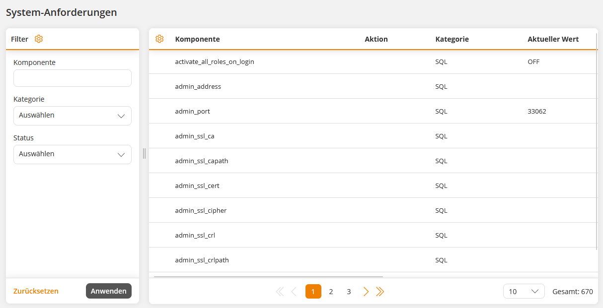 In der Komponente System-Anforderungen können Autoren Listenansichten mit Hilfe von Klassen und Objekten verarbeiten. Autoren sehen in der Übersicht der Objektrechte, welche Rechte nur für User-Generated Content (UGC) relevant sind. Bei Listenansichten ohne Datenbank-Basis sind auch SQL-Wildcards akzeptiert („%“ und „_“). In der Listenansicht können Sie die Einträge geordnet nach Komponente, Aktion, Kategorie, Aktueller Wert, Erforderlicher Wert und Status einsehen und mit Hilfe der Filter durchsuchen.