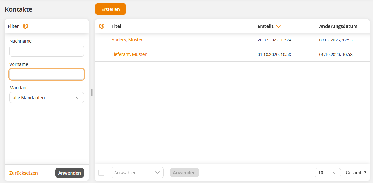 Gehen Sie auf Nutzerverwaltung → Kontakte → Erstellen. Der Assistent Kontakte öffnet sich.