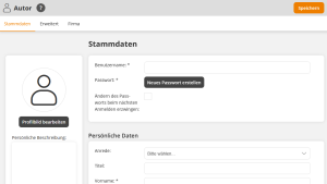 Wählen Sie unter den Stammdaten zunächst den Mandanten aus, in dem Sie den Autoren anlegen möchten, und füllen Sie anschließend die erforderlichen Felder aus: Benutzername, Vorname, Nachname und E-Mail-Adresse. Abschließend generieren Sie ein sicheres Passwort für den Autoren.