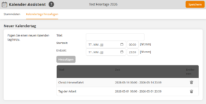Vergeben Sie jeweils einen aussagekräftigen Titel und hinterlegen Sie eine Start- und Endzeit. Klicken Sie anschließend auf Hinzufügen. Der Eintrag erscheint dann in der Liste und kann mit dem Mülleimer-Symbol wieder gelöscht werden.