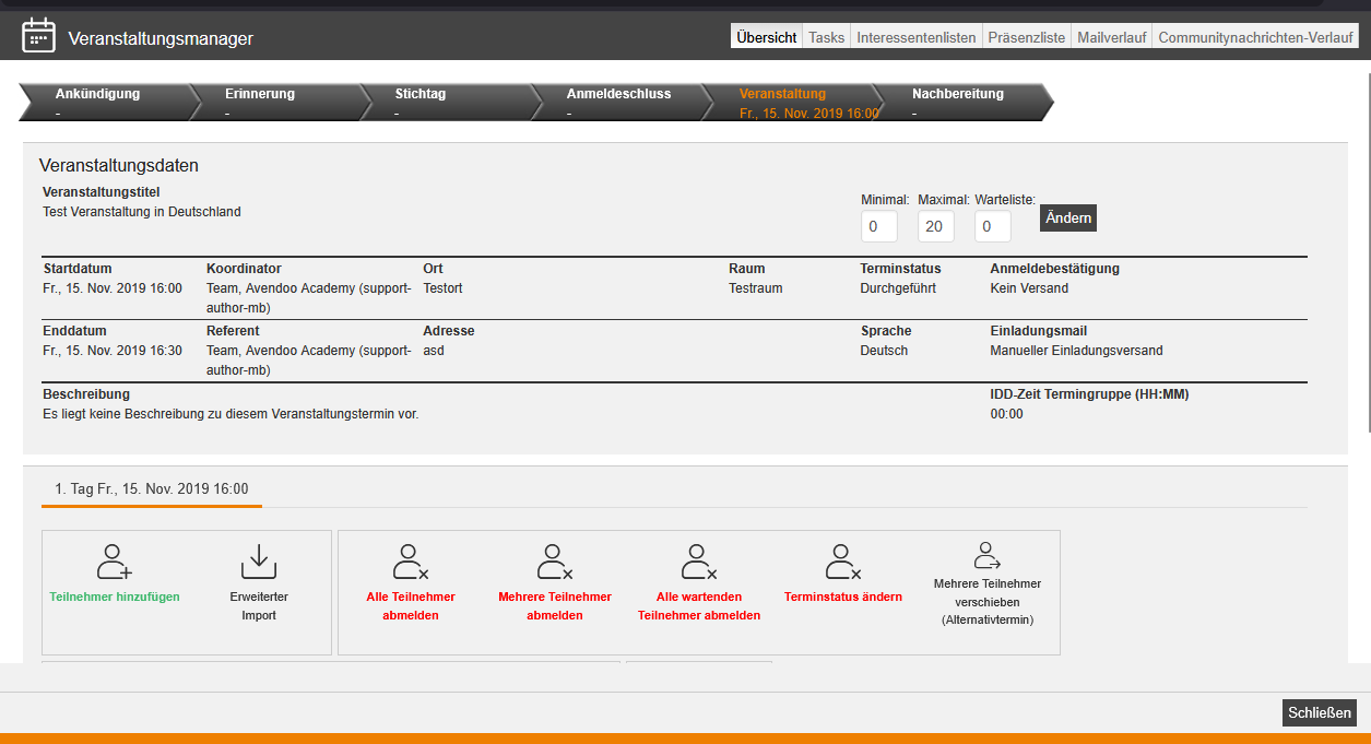 Sie können hier zudem unter anderem Teilnehmer anmelden, abmelden, die Teilnehmerliste durchsuchen und bearbeiten, den Termin stornieren und Benachrichtigungen versenden.