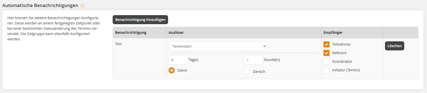 This function allows authors to configure one or more automatic notifications for event dates. These are sent automatically based on a selected trigger (e.g. time). This guide explains how to set it up.